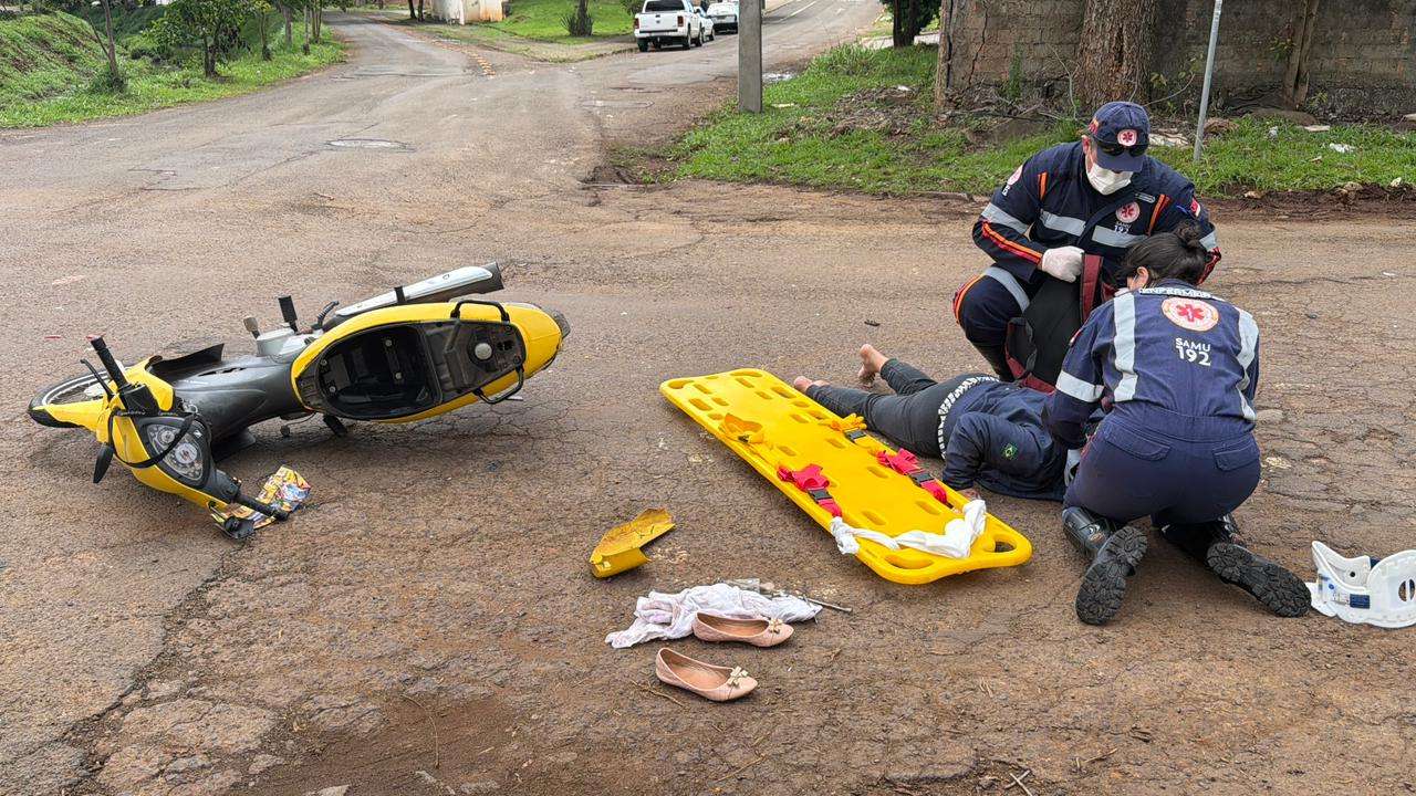 Motociclista sem CNH empina na frente de viatura, foge de abordagem policial, colide com carro e sofre fratura exposta