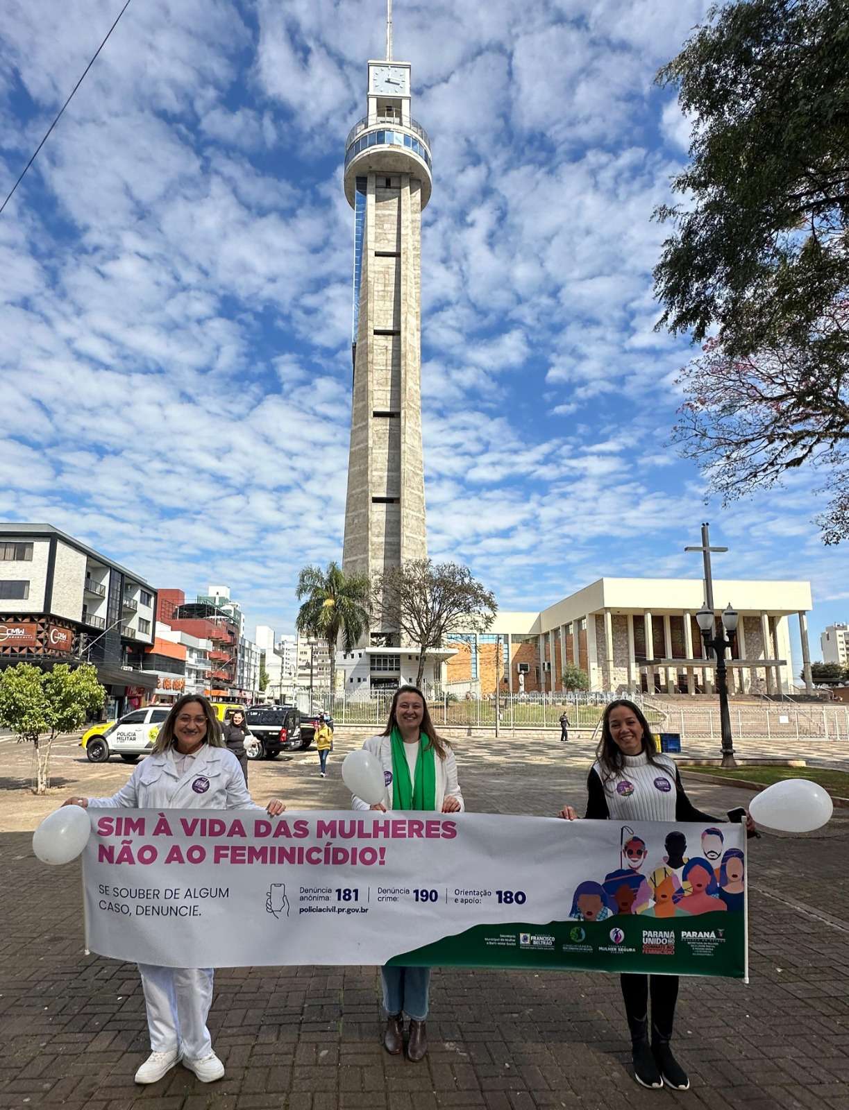 A vereadora Mara Fornazari falou durante o evento e reforçou a importância da mobilização da sociedade no enfrentamento à violência contra as mulheres. A caminhada integra a campanha estadual Paraná Unido no Combate ao Feminicídio e reuniu a comunidade em um ato de conscientização e resistência.