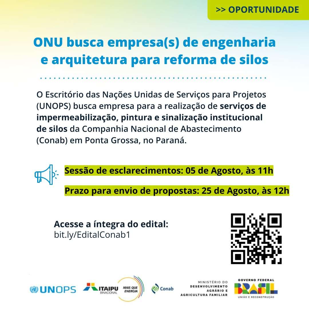 O Escritório das Nações Unidas de Serviços para Projetos (UNOPS), organismo da ONU especializado em infraestrutura, publicou nesta segunda-feira, 28 de julho, o edital de licitação para contratação da empresa de execução dos serviços de impermeabilização e pintura de identidade institucional nos armazéns graneleiros da unidade armazenadora da Companhia Nacional de Abastecimento (Conab) em Ponta Grossa, no Paraná (ITB/2025/58551). Composta por seis armazéns graneleiros horizontais e uma bateria de 16 silos verticais, possui capacidade para 420 mil toneladas de grãos e é a maior unidade da Conab no país.