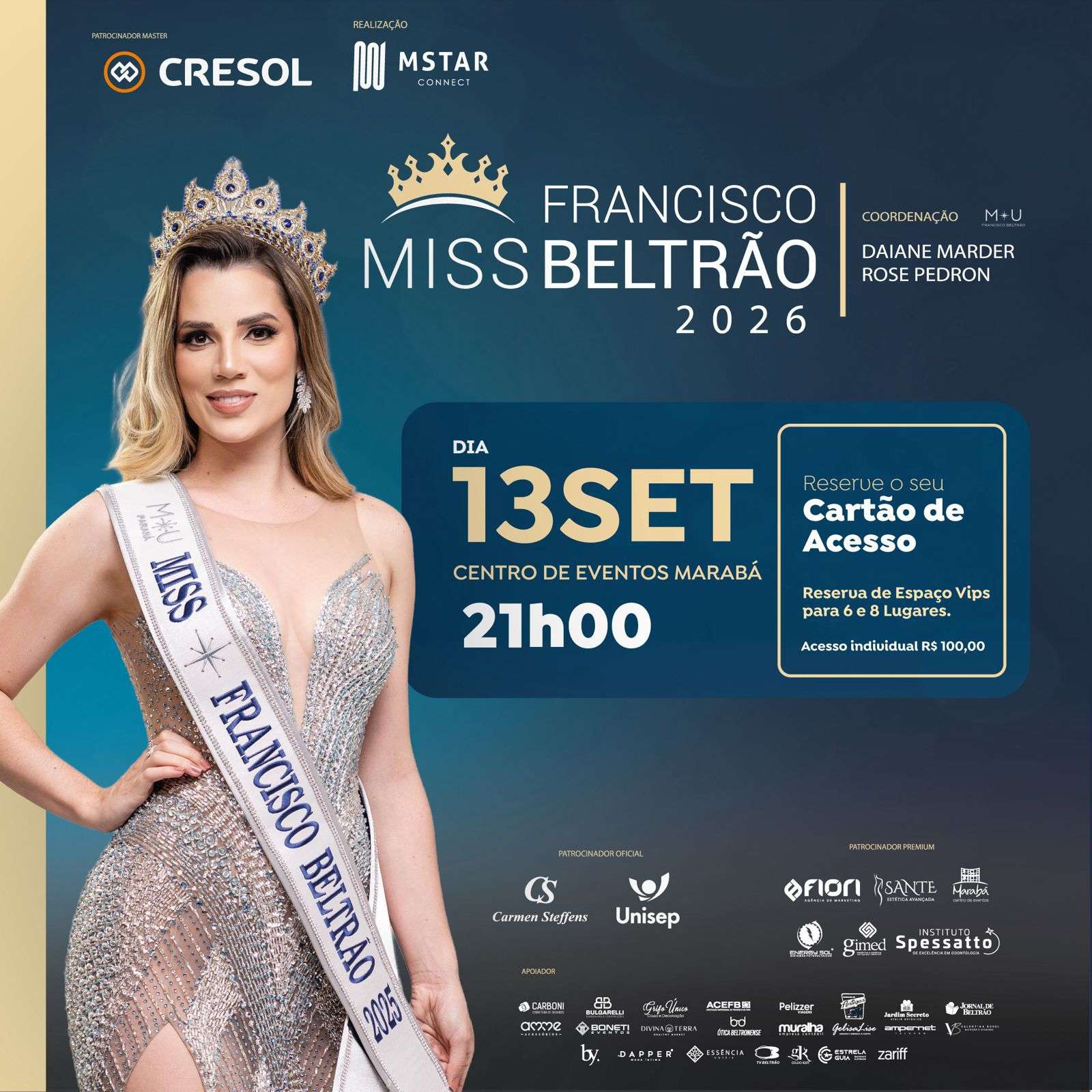 A cerimônia de escolha da miss será no dia 13 de setembro no Marabá Centro de Eventos a partir das 21:00 horas. A organização, que tem a M’Star Connect à frente, com as coordenadoras Rose Pedron e Daiane Marder promete uma noite de muita elegância e glamour para marcar concurso de 2025.