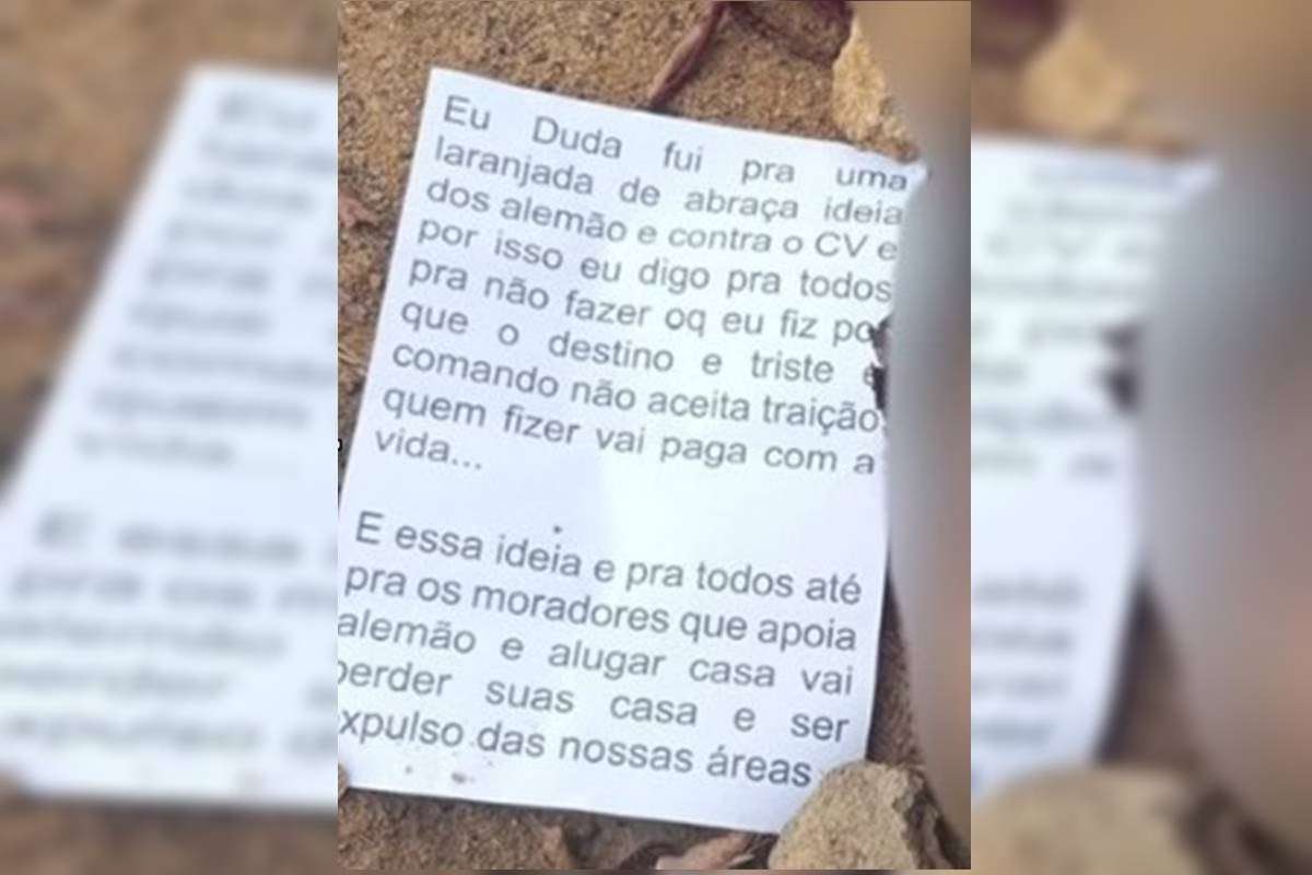 “Eu, Duda, fui para uma ‘laranjada’ de abraçar a ideia dos alemão contra o CV. Por isso, eu digo a todos para não fazer o que eu fiz, pois o destino é cruel. O comando não aceita traição”, diz o bilhete.