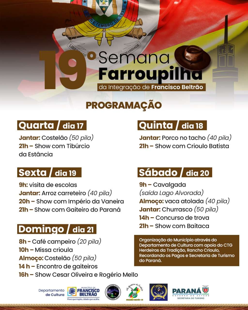 Nos próximos dias Francisco Beltrão promove um dos maiores eventos do tradicionalismo gaúcho no Estado. A 19ª Semana Farroupilha da Integração inicia quarta-feira (17) e vai até domingo (21) com uma série de atrações na música, concursos, gastronomia e ações educativas. O evento é organizado pela prefeitura, através dos departamentos municipal de Cultura e o de Turismo, com apoio dos três CTGs – Rancho Crioulo, Herdeiros da Tradição e Recordando os Pagos – e grupos tradicionalistas. A Secretaria de Estado do Turismo também apoia o evento.