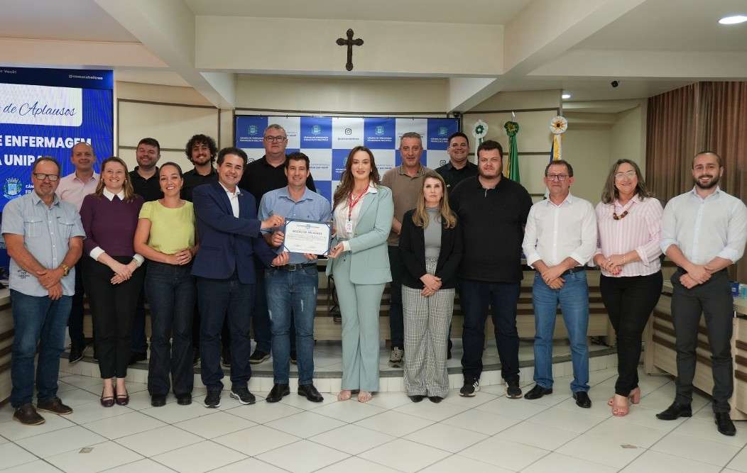 A autoria da honraria é do vereador Junior Nesi, enfermeiro egresso do curso, e recebeu aprovação unânime no Legislativo. Representaram a universidade o diretor do campus, Claudemir José de Souza, e a coordenadora do curso, Lediana Dalla Costa. Durante os discursos todos enalteceram a importância do curso para a formação destes profissionais de saúde para a nossa região, bem como da Unipar, que é uma das universidades mais importantes do Paraná e do Brasil.