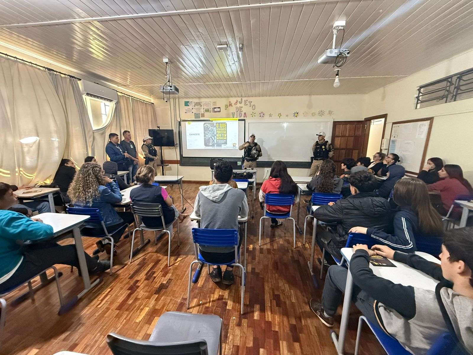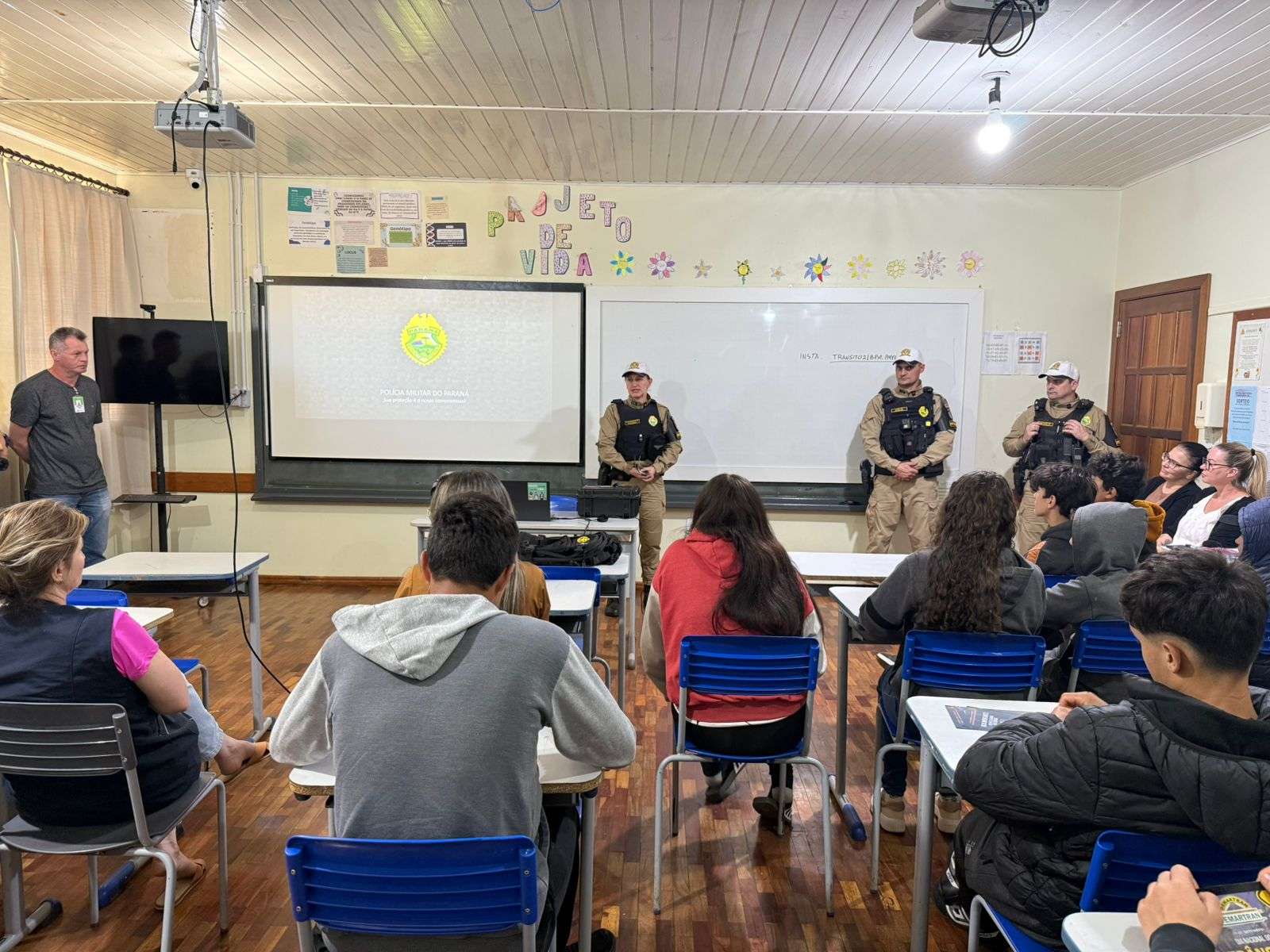 Nesta sexta-feira (19), o Pelotão de Trânsito do 21º Batalhão de Polícia Militar (BPM), em Marmeleiro, deu continuidade ao Projeto Jovem no Trânsito, promovendo um diálogo educativo com 34 alunos do Colégio Estadual do Campo Bom Jesus.