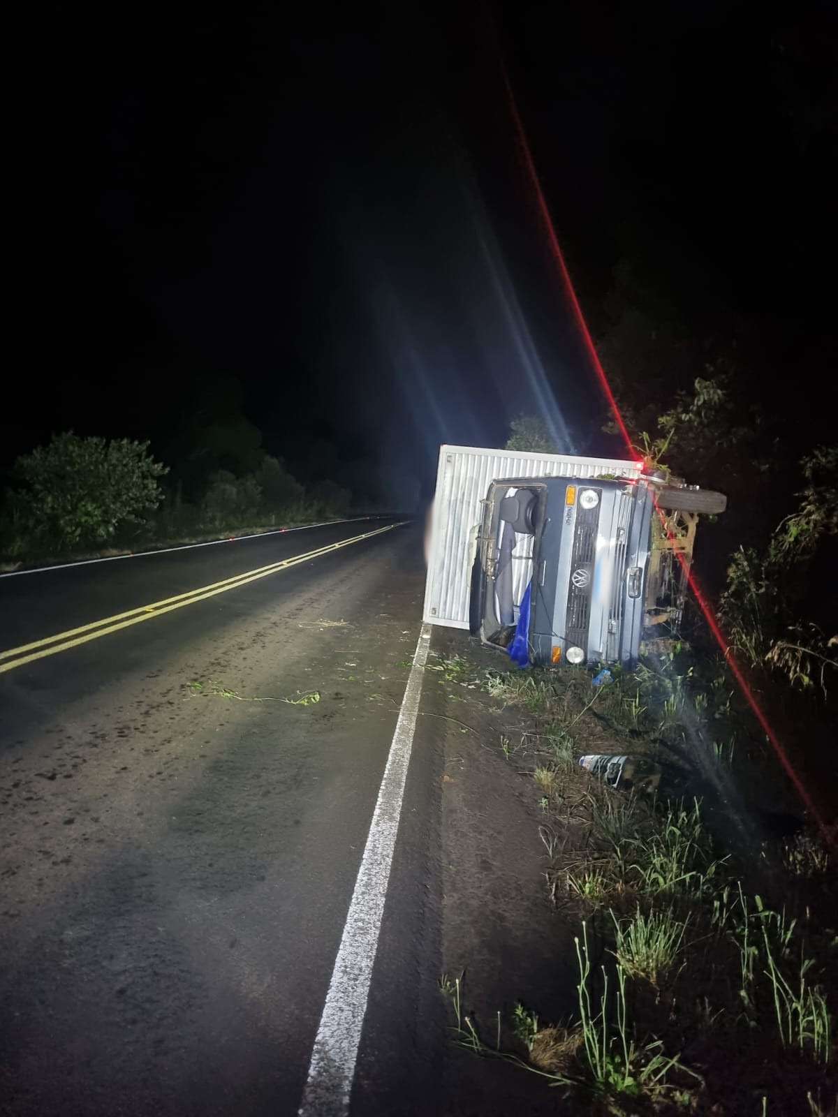 O caminhão VW/6.90 tombou às margens da pista e teve danos materiais. Felizmente, não houve registro de feridos. As equipes realizaram o atendimento no local e sinalizaram a via até a remoção do veículo.