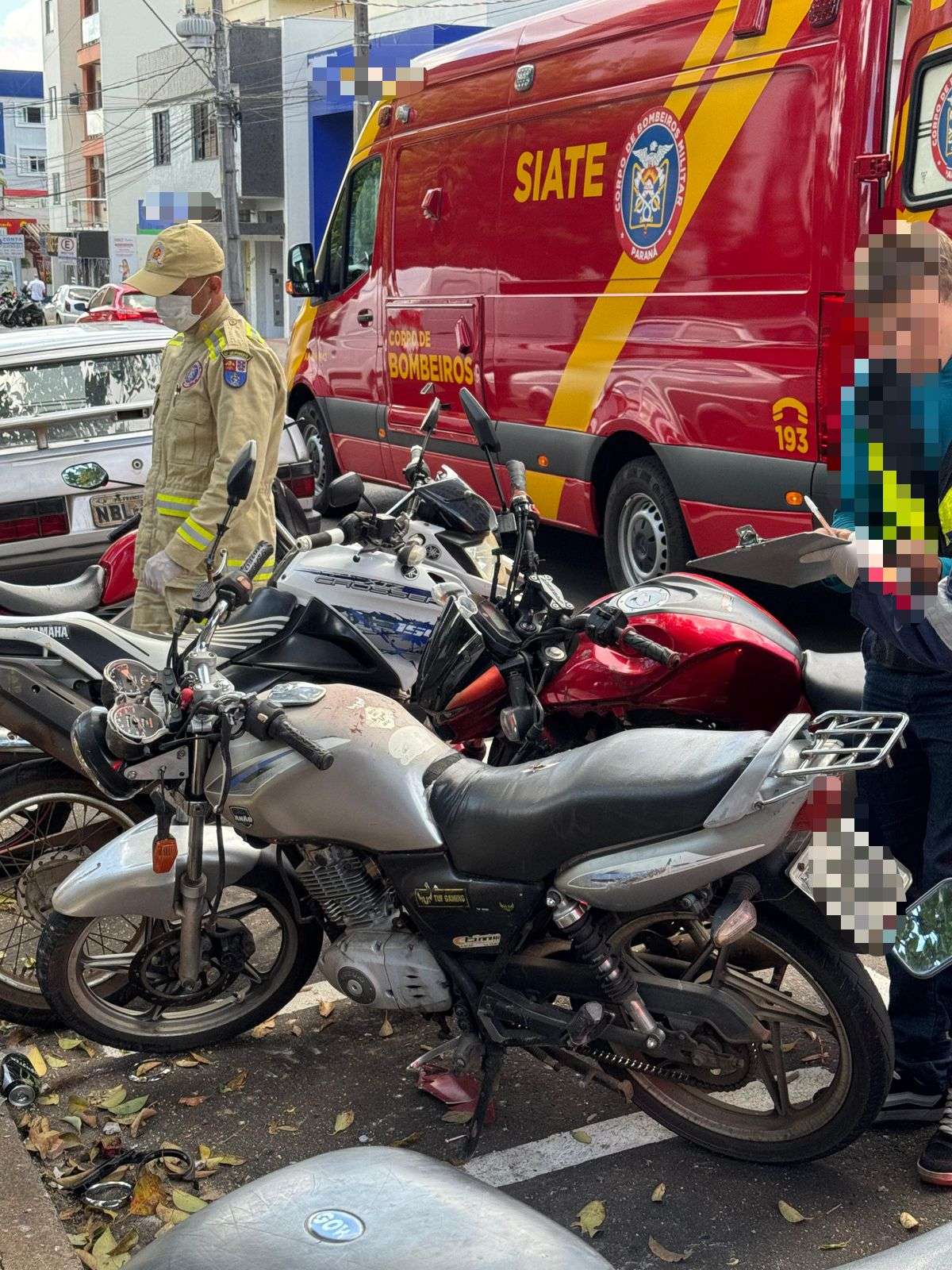 O condutor da Suzuki sofreu um ferimento na perna e foi encaminhado para atendimento médico hospitalar. Já o piloto da Fazer teve apenas escoriações leves e não precisou de atendimento. Equipes do Corpo de Bombeiros e do SAMU prestaram auxílio no local.