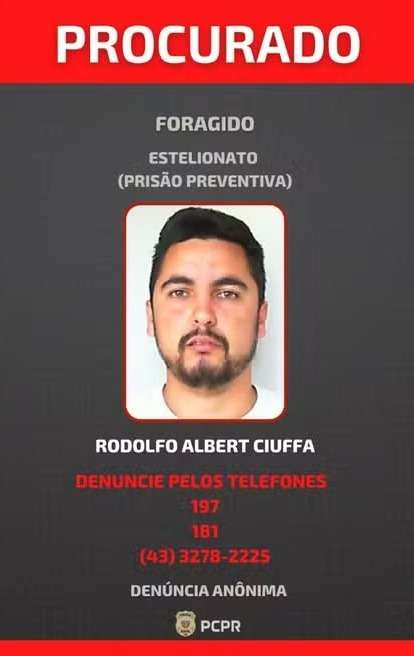 Rodolfo Albert Ciuffa, de 33 anos, está sendo procurado pela Polícia Civil do Paraná (PC-PR) por aplicar golpes vendendo várias vezes o mesmo terreno que não era dele, em Arapongas, no norte do estado. Conforme a investigação, vítimas tiveram prejuízos que variam entre R$ 10 mil e R$ 3 milhões.