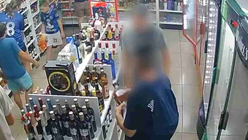 Nas gravações, é possível ver o filho colocando uma garrafa de Uísque The Breeder’s Choice dentro da calça antes de deixar o local. Logo em seguida, o pai esconde uma garrafa de Campari no shorts e também sai da loja.