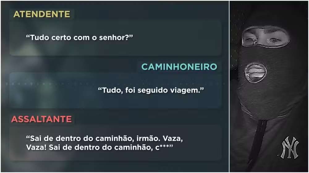 O áudio da ligação registra a atendente perguntando se estava “tudo certo” e o motorista dizendo: “Tudo, foi seguido viagem”. Logo depois, a gravação capta a ordem do bandido: “Sai de dentro do caminhão, irmão. Vaza!”.