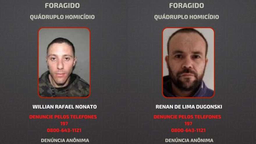 A Polícia Civil do Paraná (PCPR) divulgou nesta quinta-feira (15) imagens de dois homens foragidos, suspeitos de envolvimento em quatro homicídios ocorridos no bairro Campo do Santana, em Curitiba. O crime foi registrado durante uma festa de aniversário infantil, realizada no dia 2 de novembro de 2025.