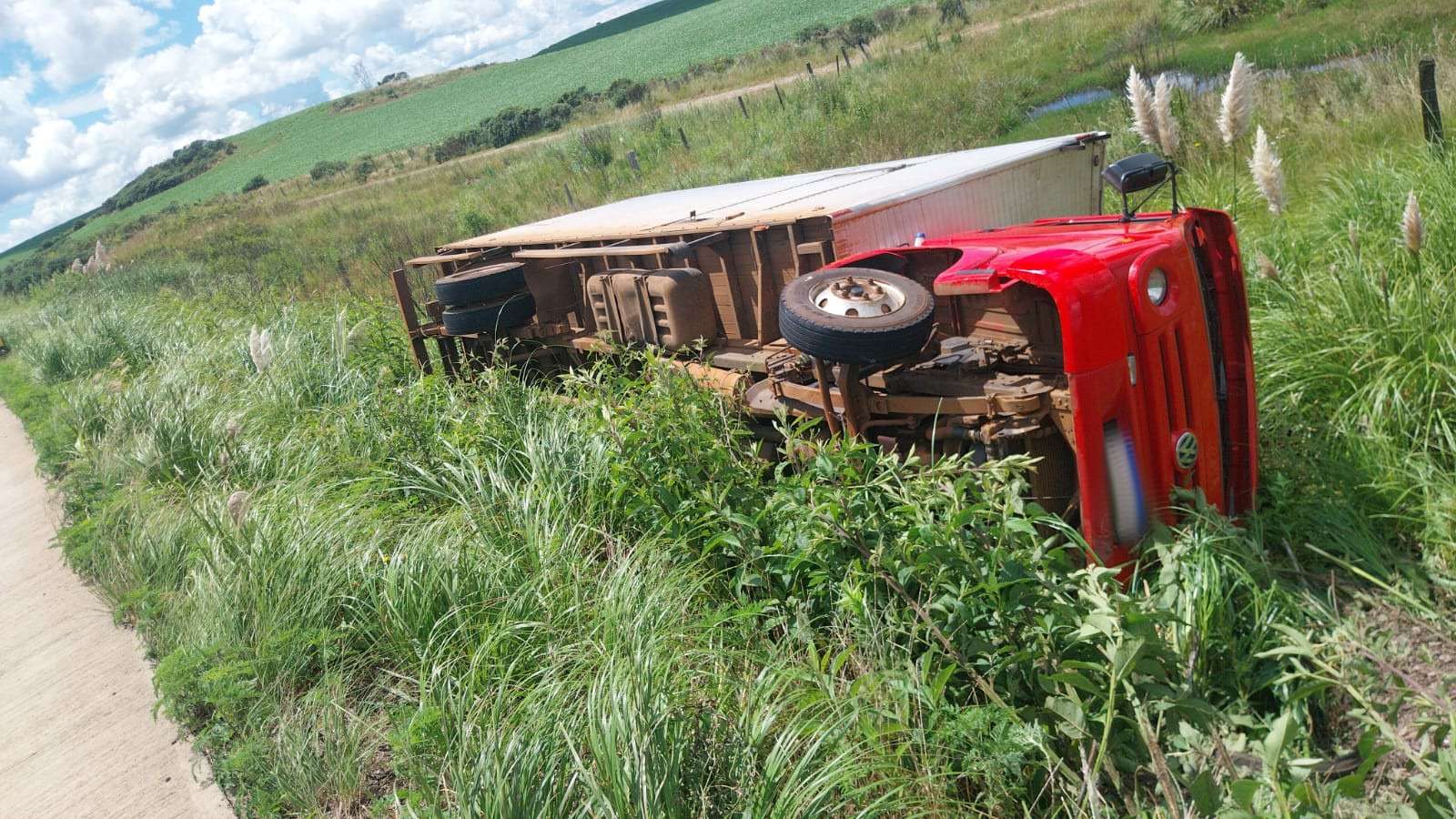 De acordo com o relato do condutor, um homem de 37 anos, o caminhão seguia em direção ao entroncamento com a BR-153 quando outro veículo realizou uma manobra de ultrapassagem. Ao tentar desviar, o motorista perdeu o controle da direção, saiu da pista e acabou tombando às margens da rodovia.