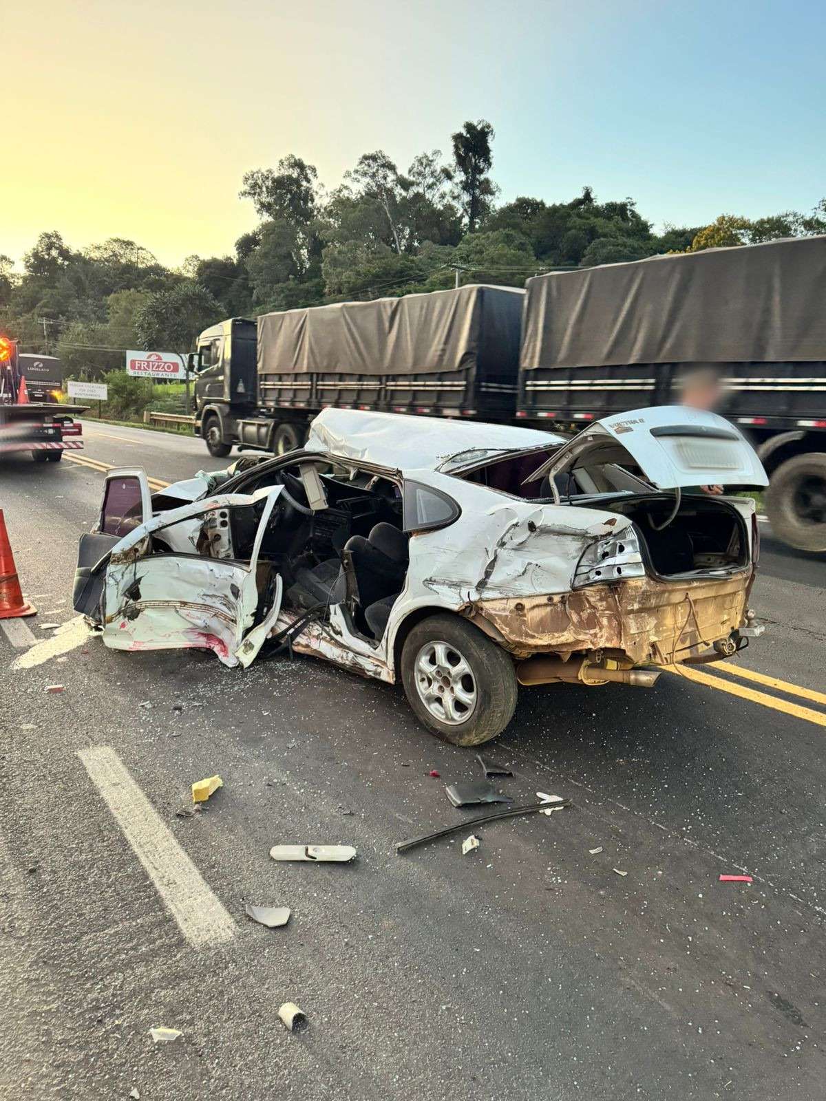 Um acidente de trânsito foi registrado na tarde de segunda-feira (9) na rodovia PR-483, em Francisco Beltrão, no sudoeste do Paraná. A ocorrência, atendida por volta das 18h15 pela 6ª Companhia do Batalhão de Polícia Rodoviária, envolveu um automóvel GM Vectra e uma composição de carga Scania R450, formada por caminhão-trator e semirreboque de quatro eixos.