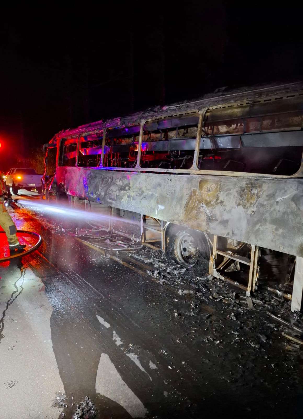 Segundo as informações, os policiais foram acionados após solicitação do Corpo de Bombeiros para prestar apoio em uma ocorrência envolvendo um ônibus que foi completamente consumido pelas chamas. Ao chegar ao local, a equipe realizou a sinalização da rodovia, com o objetivo de garantir a segurança dos demais motoristas e evitar novos acidentes.
