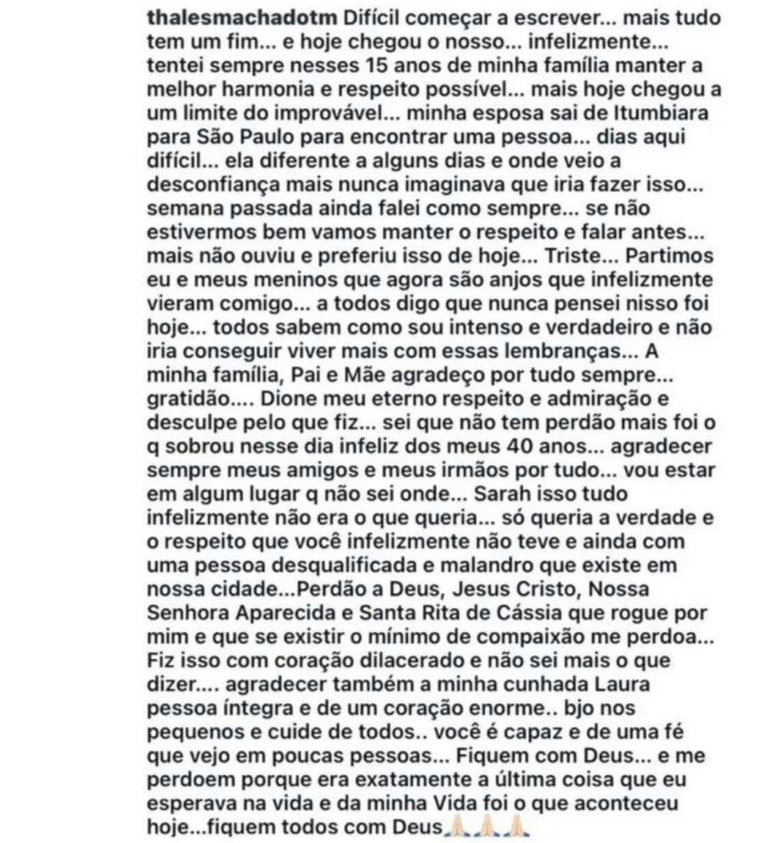 Na noite dessa quarta-feira (11/2), horas antes da tragédia, Thales fez uma publicação em uma rede social com declarações de amor aos filhos. “Que Deus abençoe sempre meus filho. Papai ama muito”, escreveu ele.