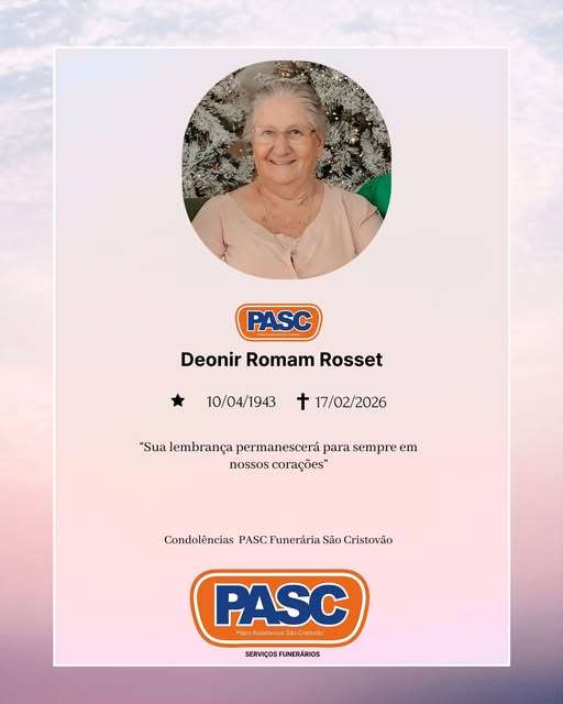 Deonir Romam Rosset, de 82 anos, faleceu nesta terça-feira (17), deixando 3 filho, netos, bisnetos, demais familiares e amigos.