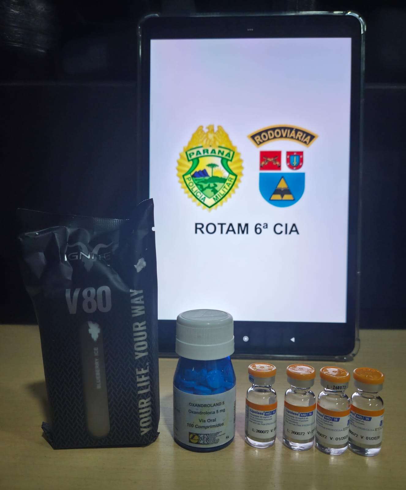Na noite de quinta-feira (26), por volta das 20h30, a equipe da 6ª Companhia do Batalhão de Polícia Rodoviária (BPRv), por meio da ROTAM, realizou a apreensão de medicamentos proibidos e anabolizantes durante fiscalização na PR-182, no km 468, em Realeza. A ação ocorreu no âmbito da Operação Protetor.