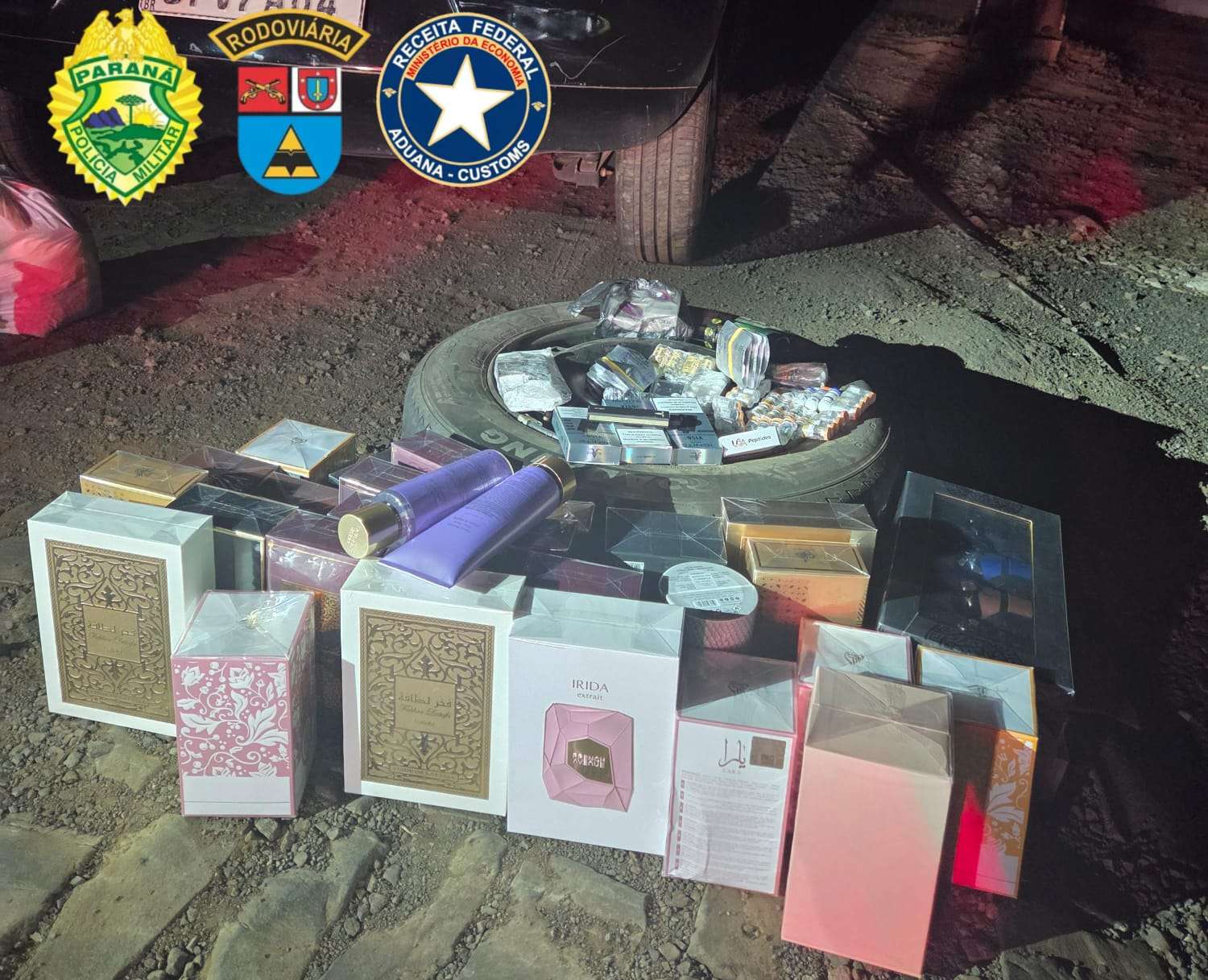 Durante a fiscalização, os policiais abordaram um veículo VW/Fox e, na revista veicular, localizaram diversos perfumes e cosméticos sem o devido desembaraço aduaneiro. Também foram encontrados anabolizantes, medicamentos e dispositivos eletrônicos do tipo vaper, itens com importação e comercialização proibidas no país, configurando, em tese, o crime de contrabando e descaminho.