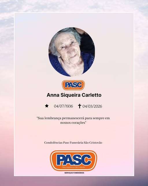 Anna Siqueira Carletto, de 89 anos, faleceu nesta quarta-feira (04), deixando esposo, 4 filhos, 1 nora, 4 genros, 9 netos, 8 bisnetos, demais familiares e amigos.