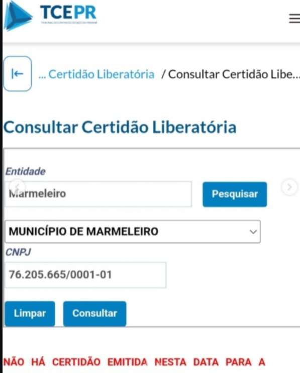 Ademais, cabe informar que, juridicamente, sem a Certidão Liberatória do TCE-PR, o Município de Marmeleiro fica impedido de celebrar convênios e receber recursos do Governo do Estado e da União.
