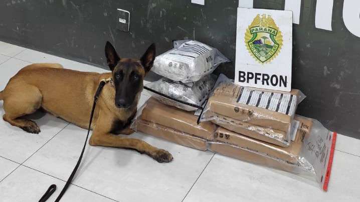 Durante a vistoria, o cão de faro “Oslo” indicou a presença de substâncias ilícitas no veículo. Na sequência, os policiais realizaram buscas nas bagagens dos passageiros.