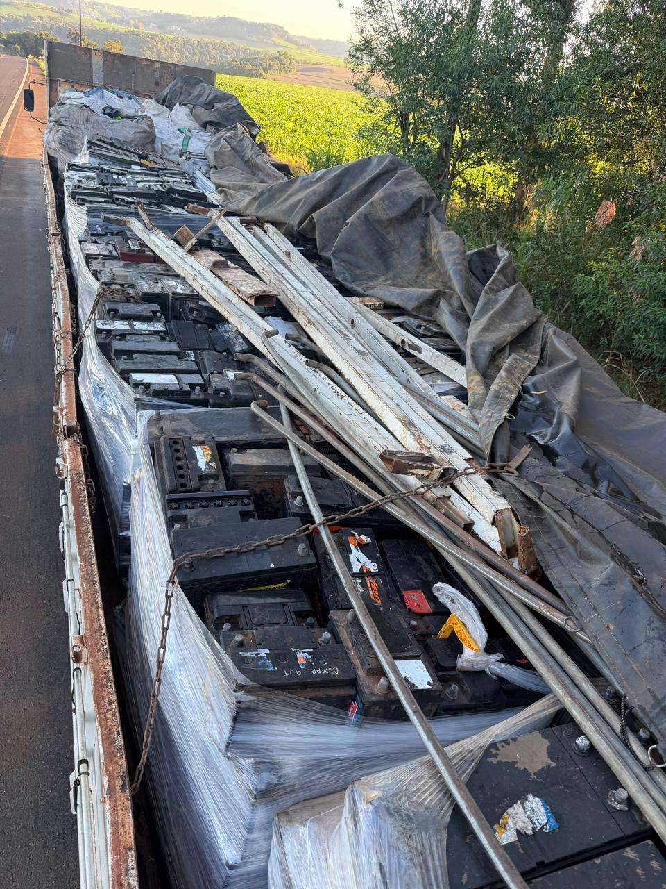 Ao inspecionar o veículo abandonado – um cavalo trator de placas NAO-3A83, acoplado a um semi-reboque de placas AHD-9F39 – os policiais encontraram uma carga de sucata de baterias com identificação de origem argentina. Não foi localizada nenhuma documentação que comprovasse a procedência lícita do material.