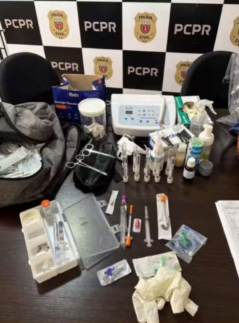 As equipes policiais cumpriram mandado de prisão e de busca no endereço do investigado. No local, foram apreendidos medicamentos e materiais utilizados em procedimentos, como seringas novas e usadas.