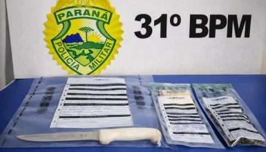Na busca veicular, foram localizadas porções de substância análoga à maconha, além de um objeto utilizado para fracionamento da droga e uma quantia em dinheiro.