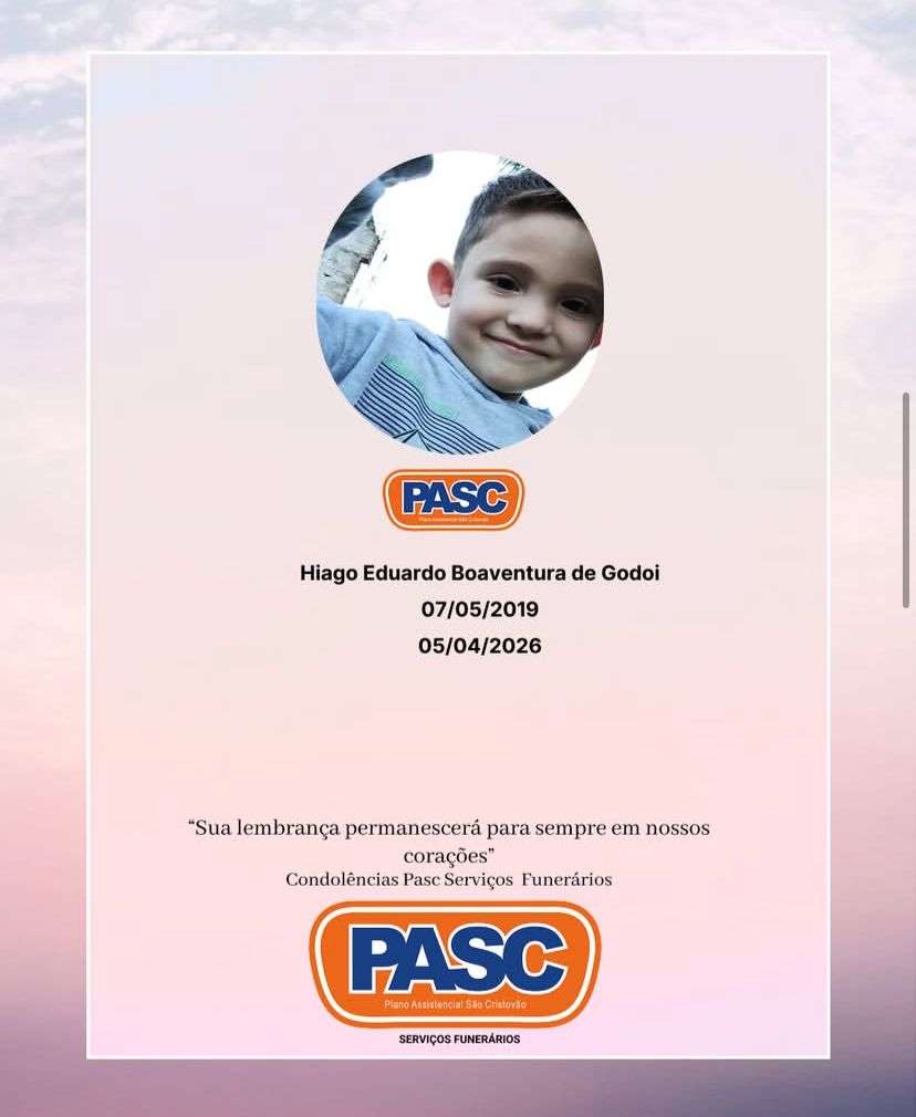 Hiago Boaventura De Godoi, de 06 anos, faleceu ontem (05), deixando pais, avós, familiares e amigos.