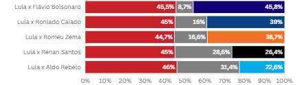 Já contra o ex-ministro Aldo Rebelo (DC), Lula aparece com 46%, enquanto Rebelo tem 22,6%. Brancos, nulos e indecisos somam 31,4%.