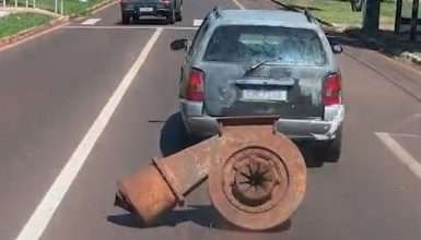 Uma situação perigosa chamou a atenção nesta sexta-feira (10), em Cascavel. Um veículo Parati foi flagrado circulando pela cidade enquanto arrastava uma peça metálica pesada presa de forma improvisada ao engate traseiro.