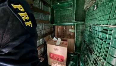 Após fiscalização avançada no compartimento de carga, foram localizadas cerca de 700 caixas de cigarros de origem paraguaia ocultas sob a carga de cobertura.