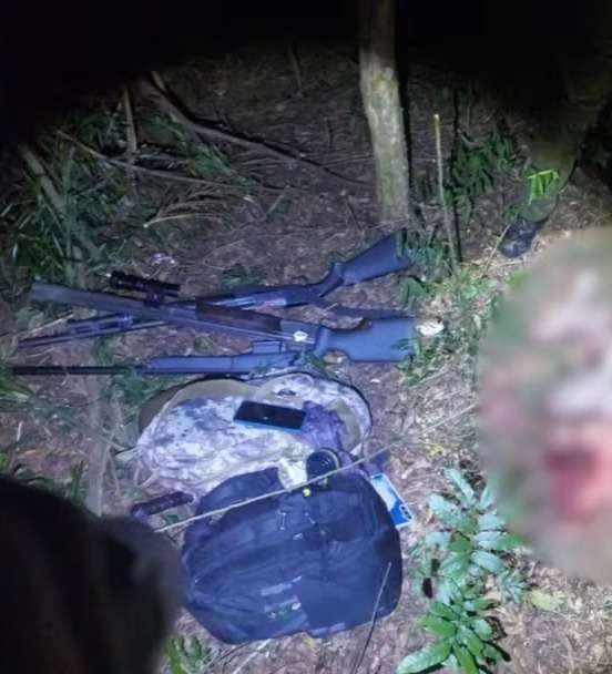 "Ao se aproximarem do local, os policiais militares identificaram movimentação suspeita e realizaram a abordagem. Na ação, foram detidos três homens, que trajavam vestimentas camufladas e portavam três armas de fogo — um fuzil calibre .762 e duas espingardas calibre .12 — além de grande quantidade de munições, facas, lanternas e mochilas utilizadas para transporte dos equipamentos".