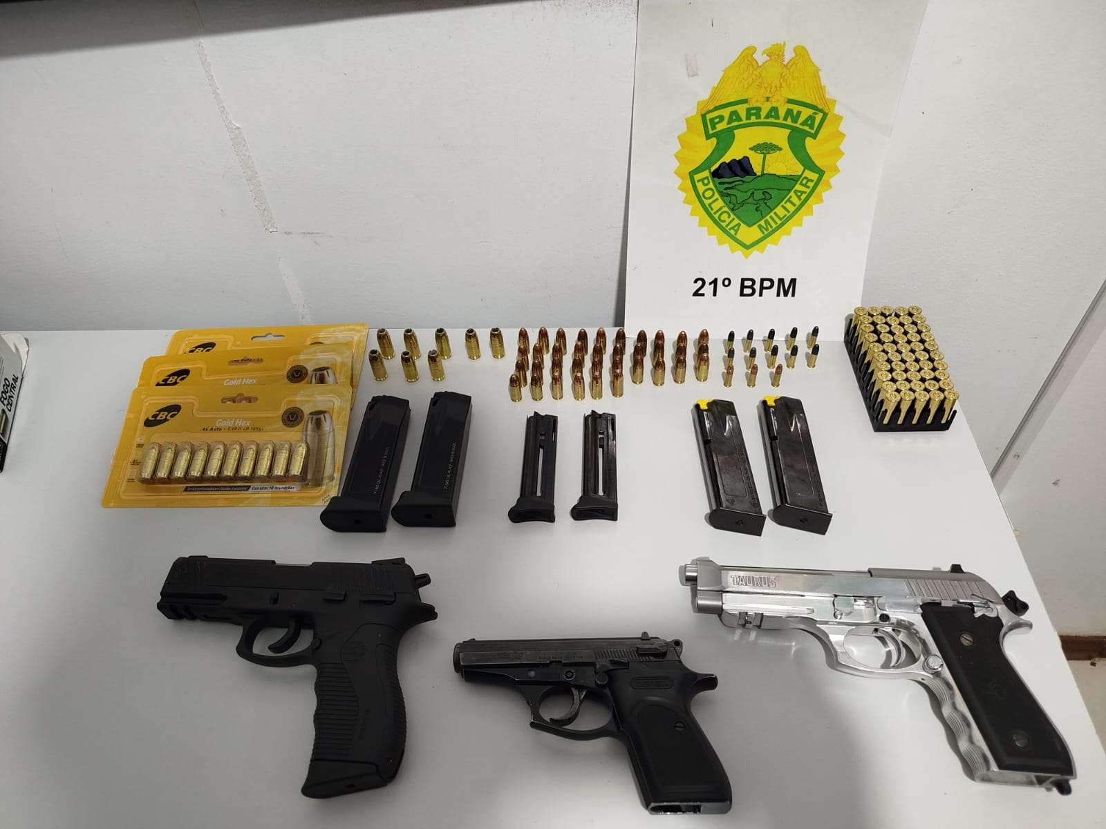 Durante a busca veicular, os policiais localizaram três pistolas de diferentes calibres — sendo uma 9mm, uma .45 e uma .22 — além de diversos carregadores e munições. Ao todo, foram apreendidas 50 munições calibre .38, 36 munições 9mm, 13 munições calibre .22 e 50 munições calibre .45.