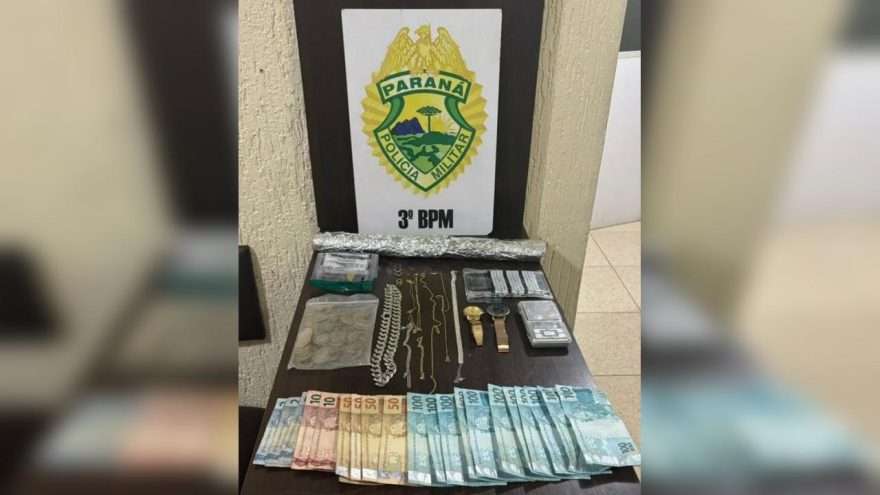 No interior da residência, os policiais apreenderam ainda uma balança de precisão, um rolo de papel alumínio, joias diversas — incluindo correntes, brincos e relógios — além de um aparelho celular e R$ 84 em moedas.
