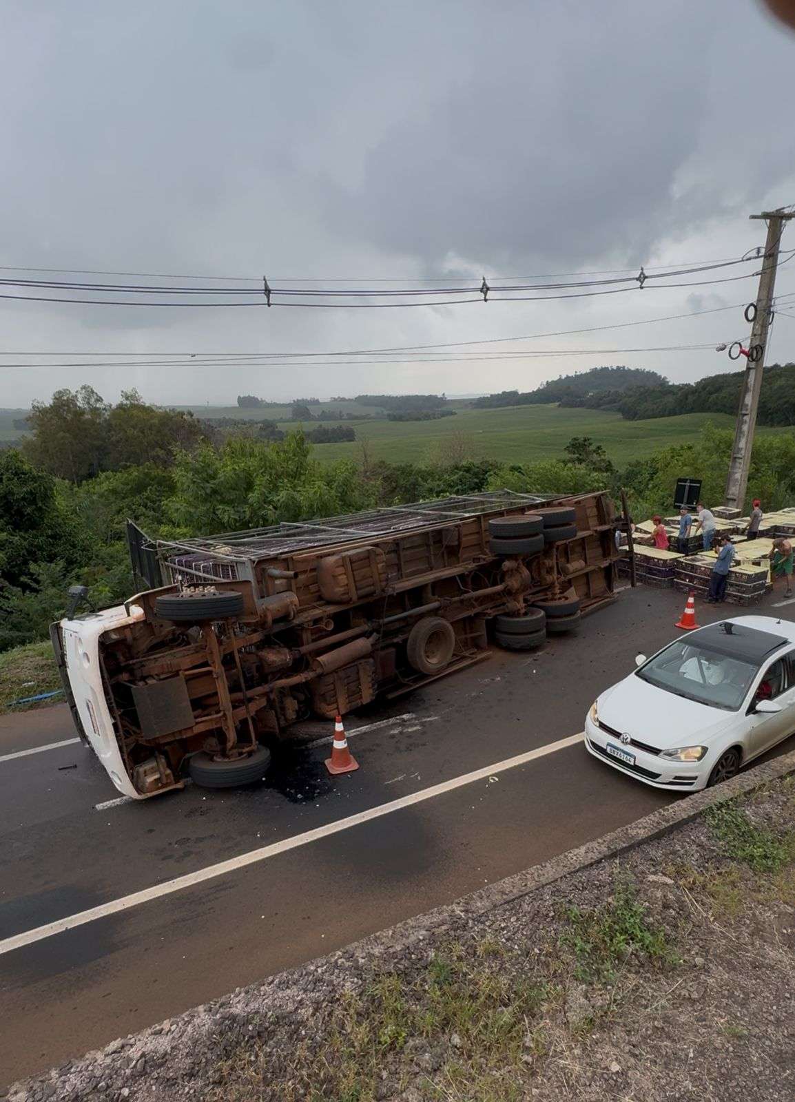 Com o caminhão tombado sobre a faixa da direita, a pista ficou parcialmente interditada durante o atendimento das equipes e os procedimentos operacionais no local.