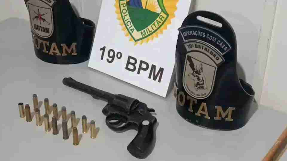 Durante buscas no carro, os policiais encontraram a arma embaixo do banco do motorista, com seis munições no tambor, sendo uma já utilizada. Também foram localizadas outras munições do mesmo calibre.