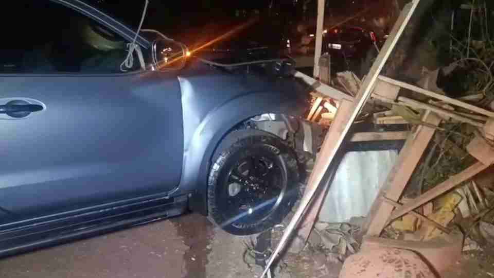 Sem tempo para frear ou desviar, a Frontier atingiu o carro. Com a força do impacto, a caminhonete ainda acertou placas de um comércio próximo ao local.