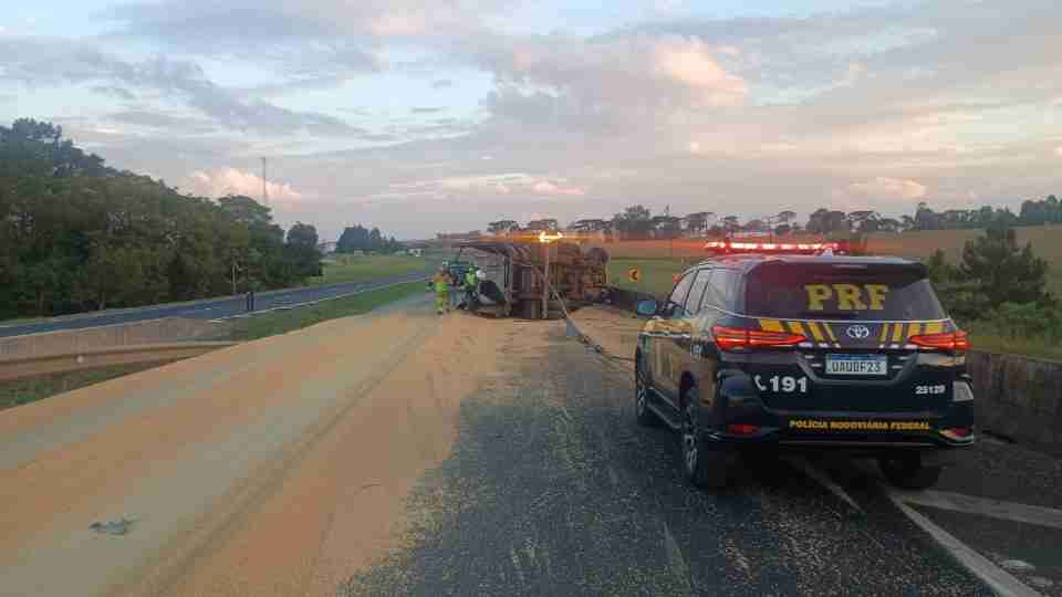 De acordo com as informações repassadas pela Polícia Rodoviária Federal (PRF), o acidente aconteceu no sentido Curitiba. Com o tombamento, a carga de soja ficou espalhada sobre a pista.