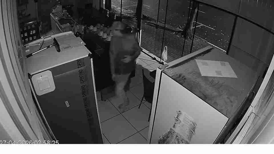 O suspeito entra na lanchonete por volta das 4h da madrugada do dia 27 de abril, após arrombar a porta. Segundo a Polícia Militar (PM), o homem usou possivelmente uma barra de ferro para quebrar o cadeado e danificar a fechadura.