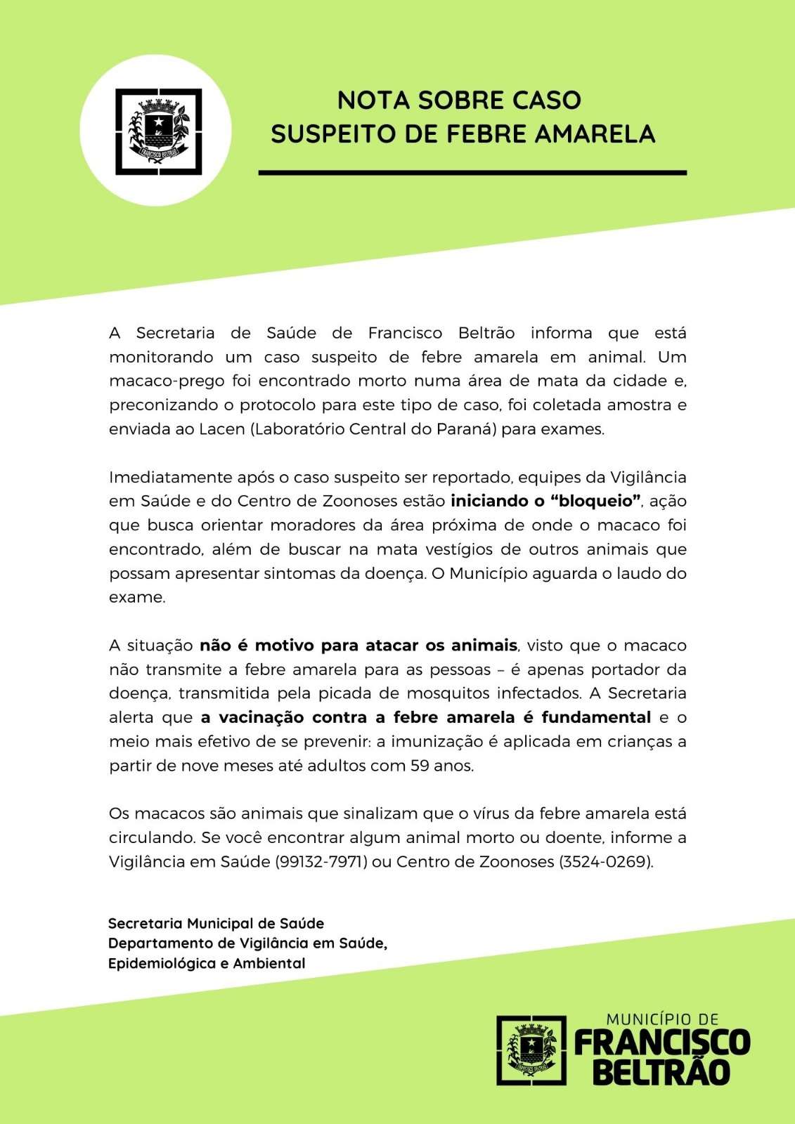 A Secretaria de Saúde de Francisco Beltrão informa que está monitorando um caso suspeito de febre amarela em animal. Um macaco-prego foi encontrado morto numa área de mata da cidade e, preconizando o protocolo para este tipo de caso, foi coletada amostra e enviada ao Lacen (Laboratório Central do Paraná) para exames.