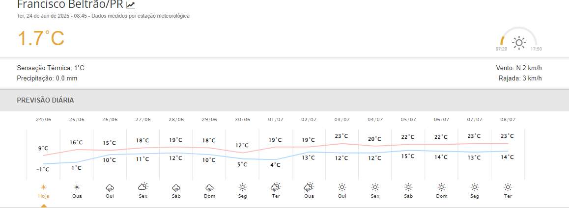 A massa de ar polar que avança sobre a região Sul provocou um declínio expressivo nas temperaturas. Na madrugada desta terça-feira (24), Francisco Beltrão registrou mínimas de -1°C, conforme previsão do Simepar. A maior parte do Paraná deve enfrentar geadas nesta terça e quarta-feira, com possibilidade de ocorrência de "geada negra" de forma localizada na região centro-sul. O fenômeno é caracterizado pelo congelamento da seiva das plantas devido aos ventos e ao frio intenso.