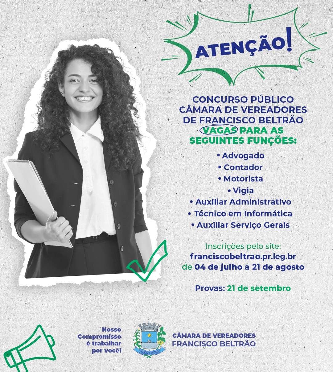 Nesta sexta-feira, (04) foram abertas as inscrições para o concurso público da Câmara de Vereadores de Francisco Beltrão para o preenchimento de vagas para sete funções, com contratações imediatas e para cadastro de reserva.