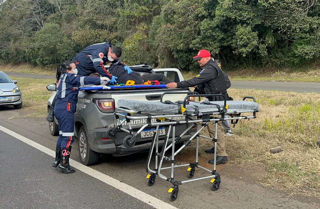 Com o impacto da batida o motociclista caiu em cima da carroceria da Strada. O condutor da moto teve ferimentos moderados e recebeu atendimento dos socorristas do Samu que o encaminharam para atendimento médico hospitalar.