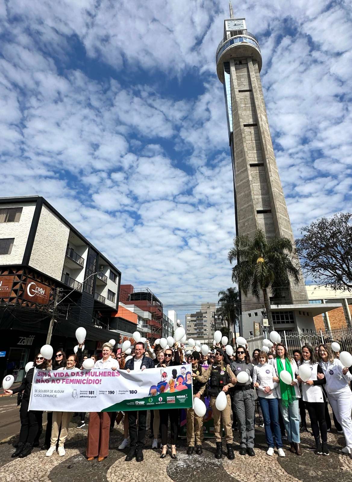 A vereadora Mara Fornazari falou durante o evento e reforçou a importância da mobilização da sociedade no enfrentamento à violência contra as mulheres. A caminhada integra a campanha estadual Paraná Unido no Combate ao Feminicídio e reuniu a comunidade em um ato de conscientização e resistência.