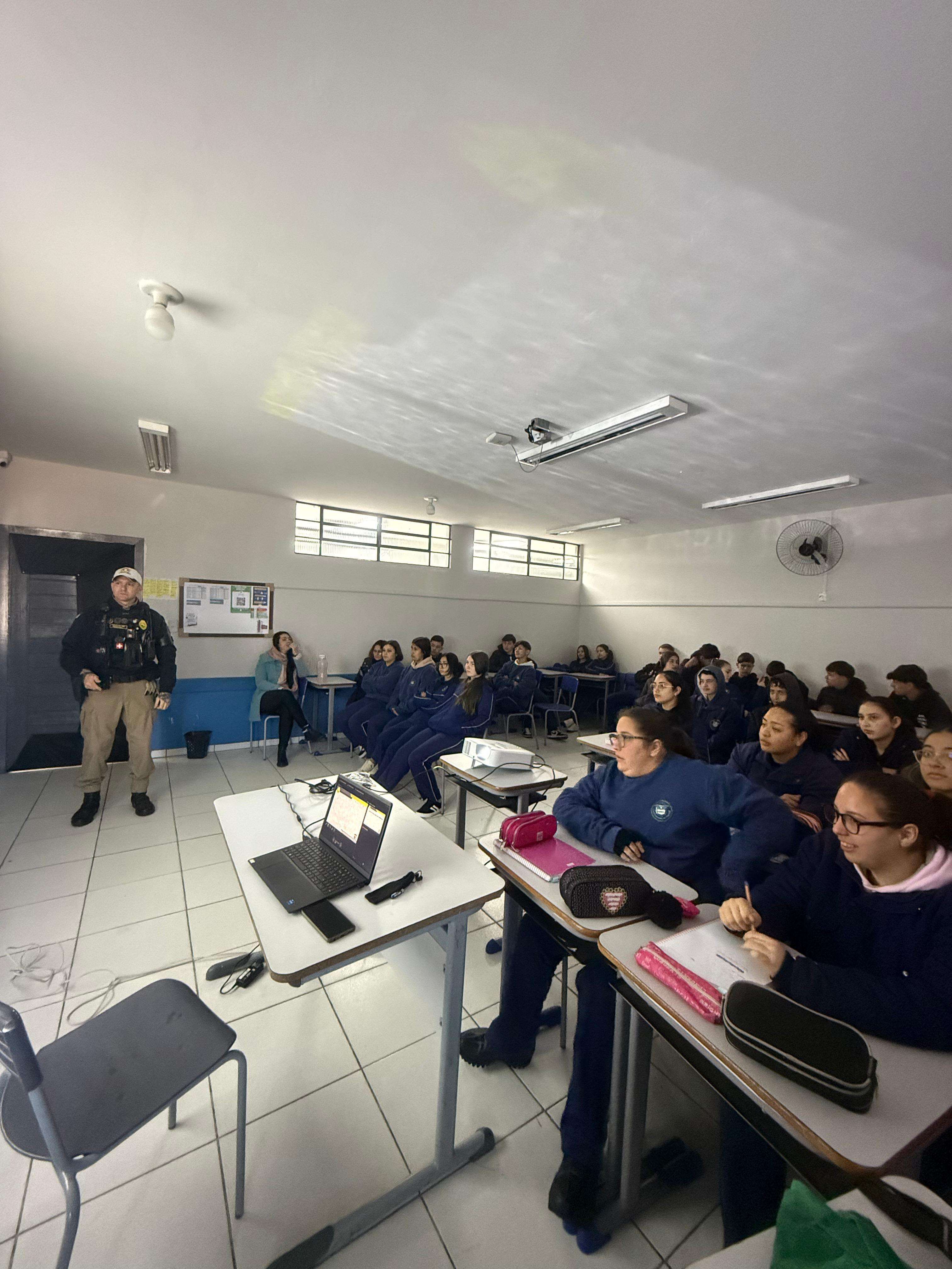 Na manhã desta terça-feira (12), o Pelotão de Trânsito do 21º Batalhão da Polícia Militar do Paraná (PMPR) promoveu mais uma ação do Projeto Jovem no Trânsito, no Colégio Estadual Cívico-Militar Vicente de Carli.