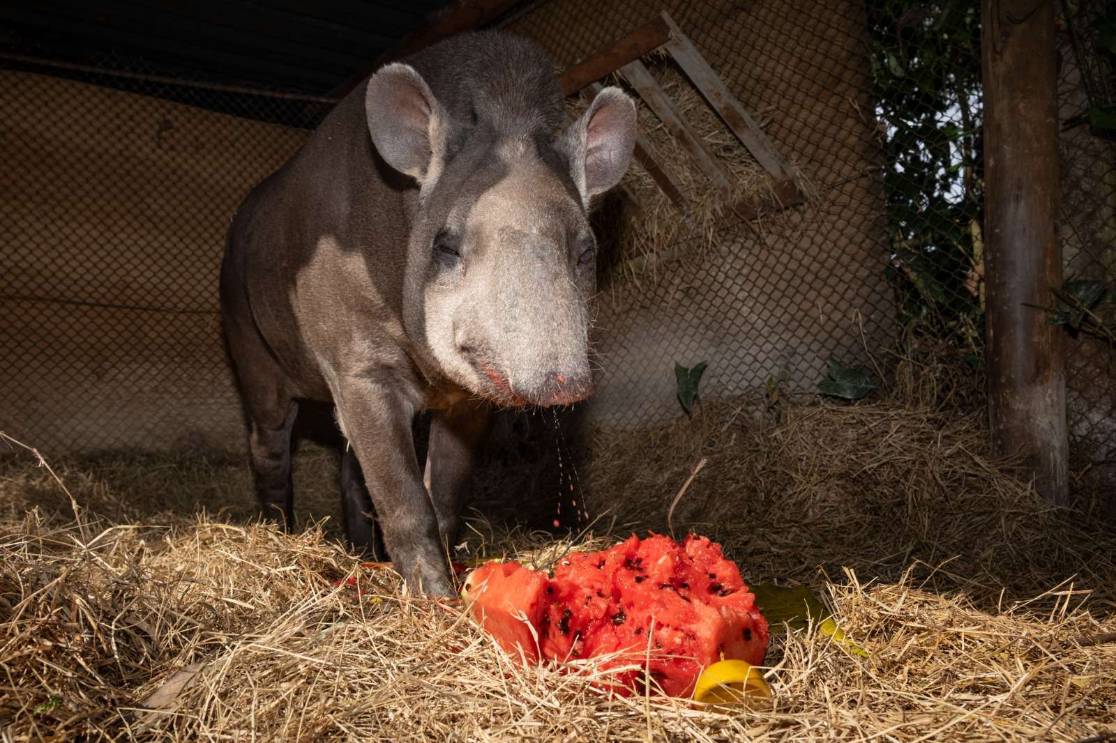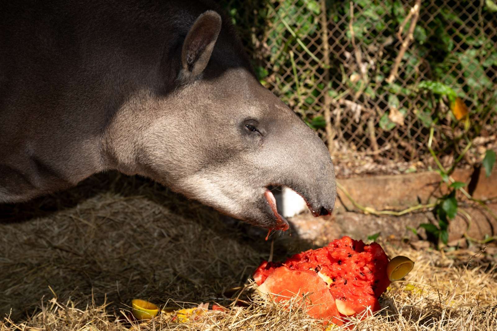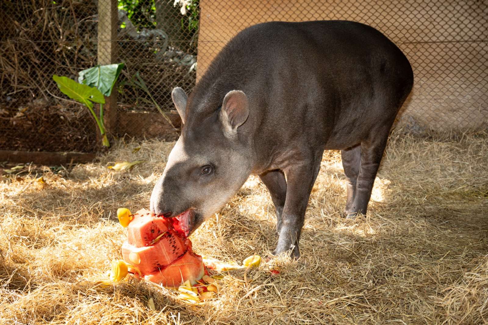 Ela é uma velha conhecida do Refúgio Biológico Bela Vista (RBV) e, nesta terça-feira (19), celebra uma marca rara entre sua espécie: a anta Margarida comemorou 32 anos. Para celebrar a data, ela recebeu um bolo feito com suas frutas preferidas no momento, melancia e maçã.
