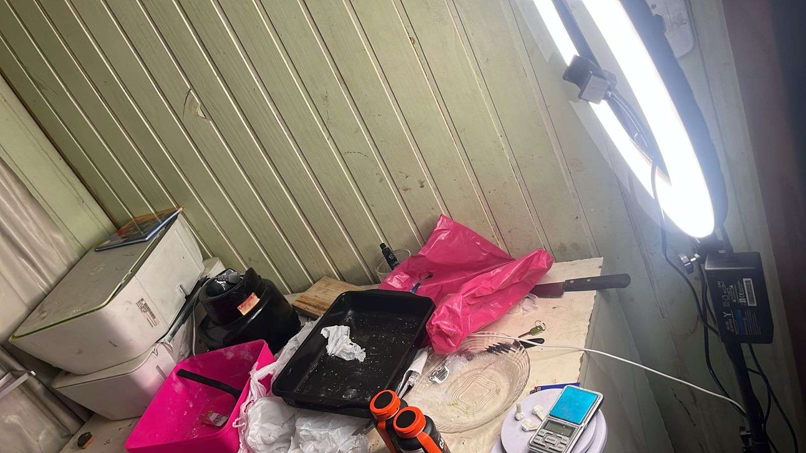 No local, foi abordado um homem de 21 anos. Durante as buscas, os policiais encontraram um verdadeiro laboratório de manipulação de entorpecentes. Foram apreendidas duas balanças de precisão, uma prensa hidráulica usada para compactar drogas em blocos, 880 gramas de cocaína pronta para venda e 920 gramas de insumos químicos para mistura. O prejuízo estimado ao crime organizado é de aproximadamente R$ 90 mil.
