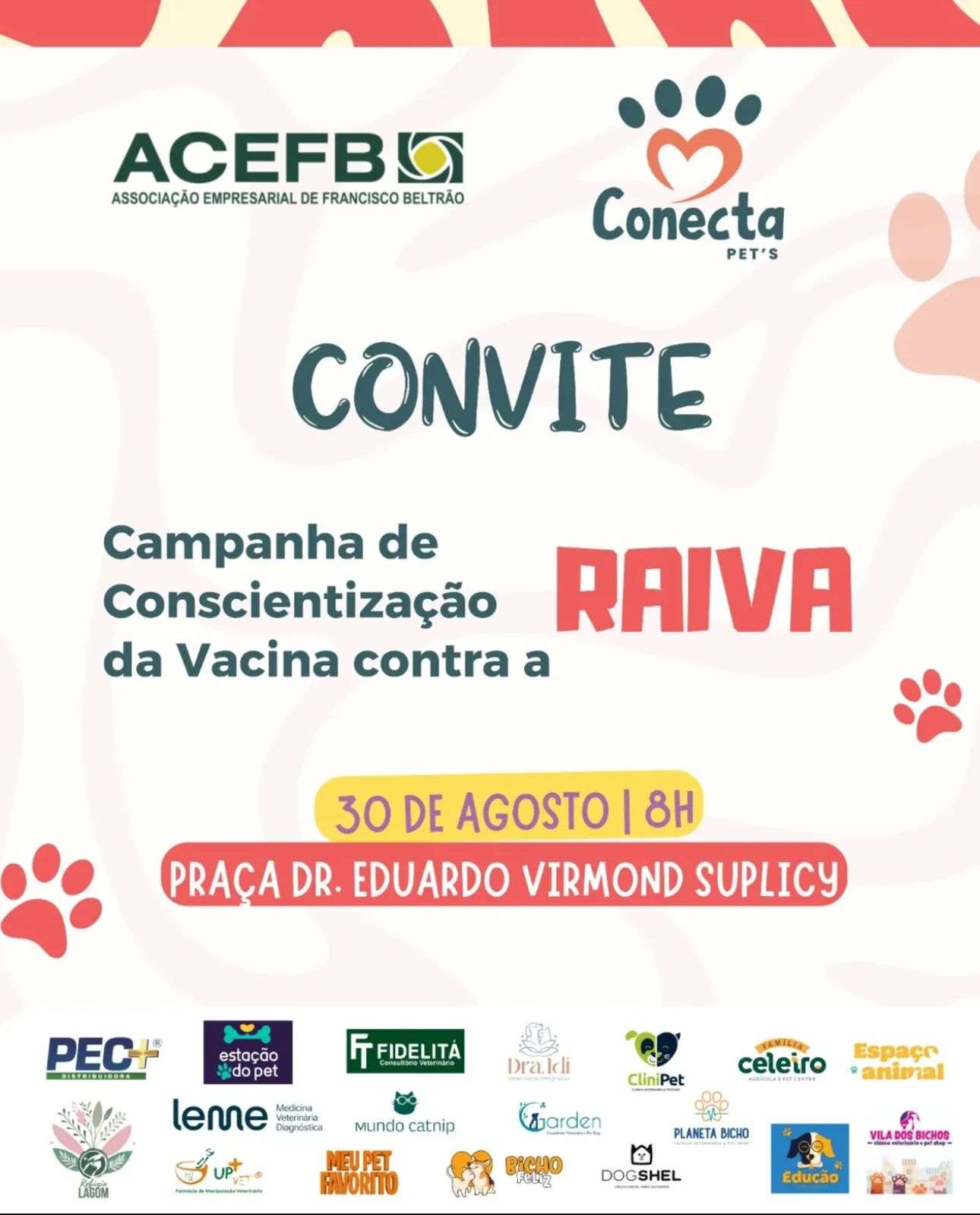 Neste sábado (30), o núcleo Conecta Pet, em parceria com a ACEFB, promove um evento de conscientização sobre a importância da vacinação contra a raiva. O evento será realizado na Praça Eduardo Virmond Suplyci e terá início as 7:30 e deve se estender até as 12 horas. A iniciativa tem como objetivo orientar a população sobre os cuidados necessários para proteger cães e gatos, além de contribuir para o controle do vírus na comunidade.
