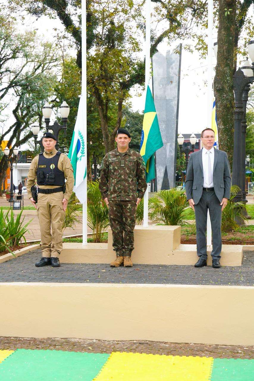 O comandante do 21º Batalhão da PM, tenente-coronel Rogério Gomes Pitz e o comandante do 16º Esquadrão de Cavalaria Mecanizado do Exército, capitão Stive Anderson fizeram com o prefeito Pedron o hasteamento das bandeiras do Paraná, do Brasil e de Francisco Beltrão.