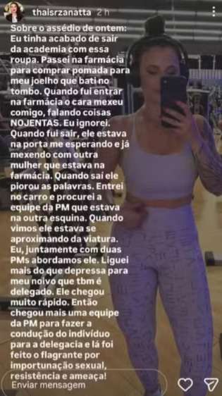"Eu tinha acabado de sair da academia com essa roupa. Passei na farmácia para comprar pomada para meu joelho que bati no tombo. Quando fui entrar na farmácia o cara mexeu comigo, falando coisas NOJENTAS. Eu ignorei. Quando fui sair, ele estava na porta me esperando e já mexendo com outra mulher que estava na farmácia. Quando saí ele piorou as palavras. Entrei no carro e procurei a equipe da PM que estava na outra esquina. Quando vimos ele estava se aproximando da viatura. Eu, juntamente com duas PMs abordamos ele. Liguei mais do que depressa para meu noivo que também é delegado. Ele chegou muito rápido. Então chegou mais uma equipe da PM para fazer a condução do indivíduo para a delegacia e lá foi feito o flagrante por importunação sexual, resistência e ameaça!"